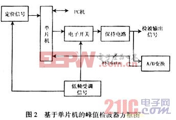 如何解决以上所讨论的问题呢?即要求得到检波输出波形良好,检波前后的信号幅值差异小,信号快变部分丢失小,检波效率高,以利于A/D变换的需要,一种较好的方法就是采用(MCU)的峰值检波电路。该电路由单片机、电子开关、保持电路等几个部分组成,其逻辑结构如图2所示。おお