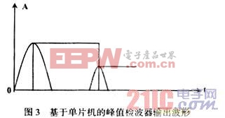该电路的特点是利用单片机编程灵活的特点,外围电路无可调件,通过单片机准确产生开关信号,使低频受调信号的检波始终被锁定在信号的峰值上,从而保证了峰值检波的效率和效果。如果由于一些技术上的原因造成信号延时,为了保证检波始终锁定在信号的峰值上,只需要通过PC机向单片机传送延时参数就可以了,避免了固定电路调整麻烦的问题。该峰值检波器的检波输出波形如图3所示。
