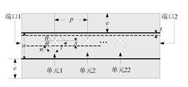 ,所以表面电流是左旋或右旋的。在对应波导上的点开启一个小圆孔就可以实现圆极化的辐射。在实际运用中,为了增加辐射效率,一般将小圆洞替换成为两个相互交叉的缝隙如图1所示。其中经过适当调整可以使得一定的角度范围内,实现近似于圆极化的辐射。当辐射单元工作在行波模式时,从一个端口来的TE