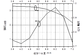 x的值(x=2.129mm)。由于等效波导内的激励模式为行波TE10模,所以X型缝隙工作在非谐振状态,其辐射效率基本上与缝隙的长度成正比。参数q可以用来校正微小的轴比恶化。当选定参数q=45,w=0.3 mm,l=3.5mm~7mm时,经过仿线参数和法线所示。图中可以看出随着缝隙长度的增加辐射效率是增加的,S21幅度是缝隙长度的减函数。但是法向轴比随着缝隙长度的增加而增加,这主要是由于在前面圆极化辐射理论的假想是一个小圆洞或小的X型缝隙辐射,在指定点上的顶面磁场是圆极化的。