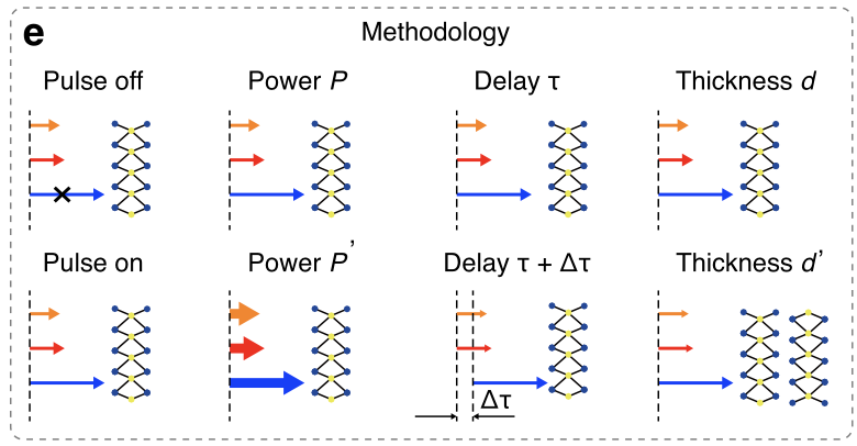 多层MoS2材料的非线性效应涉及到布里渊区K谷处的双光子吸收以及点处高能嵌套导带中的协同激发态吸收。通过设计全新的泵浦-探测-控制飞秒脉冲激发方案,其中控制光脉冲使非线性效应从双光子吸收转换至协同激发态吸收,实现非线性信号的增强,信噪比大于16dB;非线性信号可以由三种光脉冲独立调制,信号强度和功率成线性关系;三能级激发跃迁使信号弛豫寿命延长;高能嵌套导带内高电子态密度分布增强库伦屏蔽效应,使信号的厚度依赖性明显增强。因此,可以通过控制光的开关状态、激发功率、脉冲延迟时间、材料厚度等四个维度进行光信号的动态调控和多种功能设计。