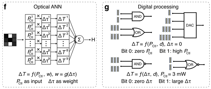 由于上述全光计算机制仅依赖材料的本征物理特性,华中科技大学团队首次直接利用纯MoS2材料构建高集成密度的全光计算阵列,无需复杂的光学结构设计,无需引入电信号耦合调控。以脉冲延迟时间编码阵列单元的权重,以激发功率编码输入信号,实现全光神经网络计算,阵列单元的计算速度达到5.6ps,计算功耗为~5.129.12pJ。精准选择计算单元的材料厚度,将激发功率编码为二进制输入信号,实现全光与门、或门、与非门、或非门和数模转换器等逻辑计算器件。相关工作为非线性全光神经网络硬件的开发提供了全新的解决思路。