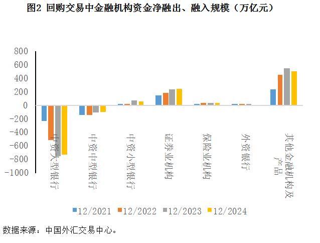 从回购市场来看,债券回购交易存在流动性传导链条,使得各交易主体的资产负债表更加紧密地联系在一起。其传导路径是:中资大型银行和中型银行是主要的资金融出方,而小型银行、证券类和保险类机构及资管产品等,则是主要的资金融入方。从2021—2024年的数据看,回购交易中多类金融机构的净融出和净融入规模均在增加。其中,资金融入方大多属于影子银行部门,其监管约束相对银行业金融机构较为宽松,且部分交易链条较长,这加剧了回购市场的脆弱性。由此来看,回购交易可能成为债券市场乃至整个金融市场交易资金不畅的潜在风险点。