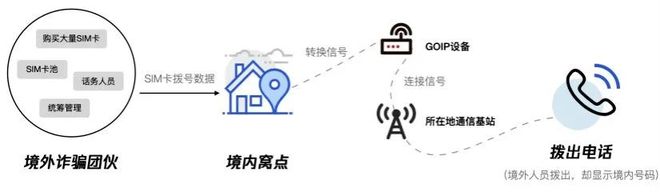 GOIP设备可将传统电话信号转为网络信号,实现人机分离、远程控制、异地拨号。诈骗分子利用国内手机卡接入电话网络,被骗事主来电显示的就是国内手机号码。