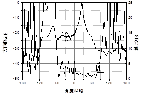 用来控制主瓣倾斜角度。由于线阵列接地面不是无限大,所以边缘的效应必须考虑。参数e是等效波导与PCB边缘之间的距离。在16GHz频点上,经过优化可以得到参数q=42.2,w=1mm,x=2.2 mm,l=7mm,p=11mm,e=7.3125mm,等效波导宽度a=8.75mm对应着SIW宽度为9.375mm(16GHz时的半个自由空间波长),PCB通孔直径为0.8mm,间隔为1.2mm,t=0.1875mm,基片的介质厚度为1.5748mm。波束倾斜角度约为25偏离天线GHz频点上的方向图和轴比的结果如图5所示。在主瓣方向的轴比为1.58dB,天线个相同的单元构成,增益为16.9dB。旁瓣电平小于-15dB。轴比在主瓣的附近位置均低于2dB,在3dB轴比限制下的角度范围大约为76,是一个圆极化角度较宽的天线阵列。